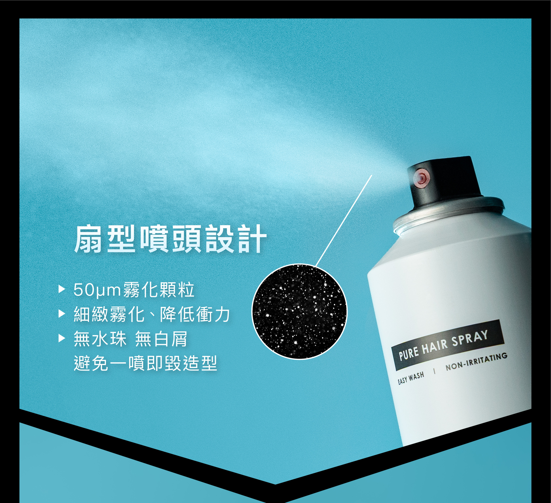 扇型噴頭設計,50um霧化顆粒,細緻霧化、降低衝力。